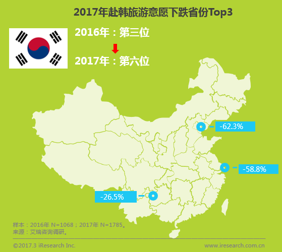 赴韓中國(guó)游客自2010年以來(lái)逐年增加,2016年首次超過(guò)800萬(wàn)人次,占赴韓外國(guó)游客的比例將近一半,同比增加34.4%(韓國(guó)文化體育觀光部數(shù)據(jù)統(tǒng)計(jì))。但根據(jù)艾瑞最新的調(diào)研數(shù)據(jù)顯示,2017年游客出境游(含港澳臺(tái))熱門(mén)目的地Top3分別是泰國(guó)、日本和香港,韓國(guó)跌至第六位,計(jì)劃赴韓人數(shù)同比2016年下跌30%,尤其是上海地區(qū)民眾赴韓意愿減弱,同比減少62.3%,其次是天津和重慶下跌明顯。