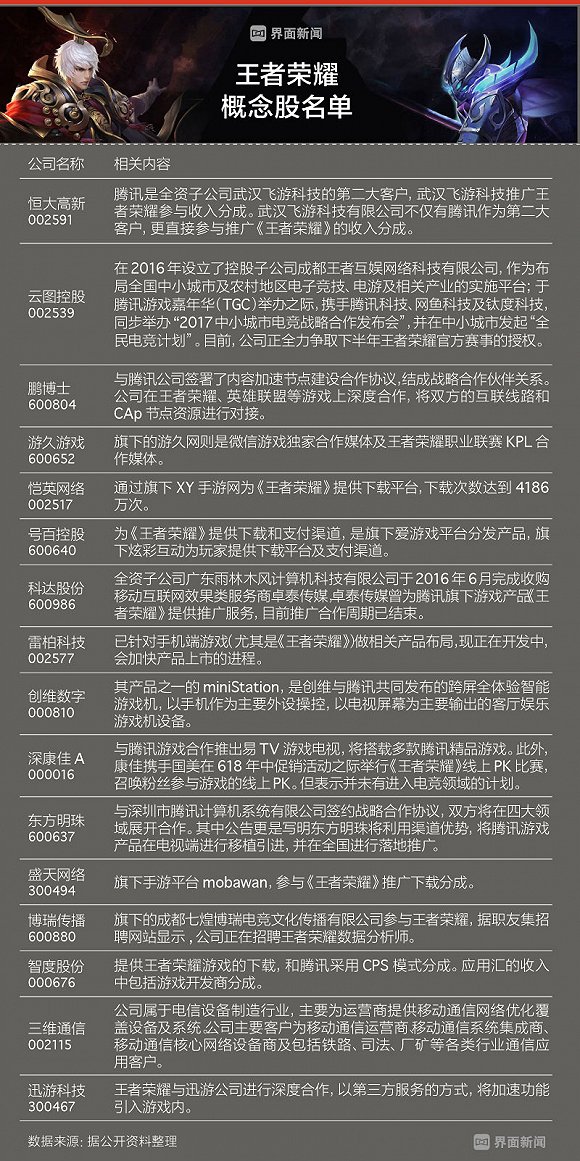 對此,一名證券業(yè)人士也對界面新聞記者分析稱,名單中的“《王者榮耀》概念股”,基本上和《王者榮耀》游戲本身沒有太強(qiáng)的聯(lián)系,更多的只是外界的炒作。