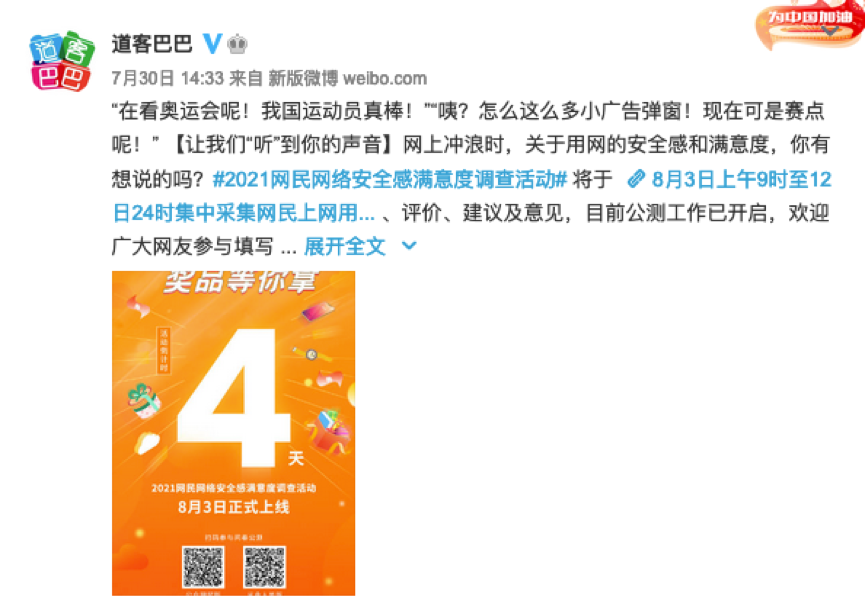 公司黨支部接到通知后,對(duì)本次活動(dòng)高度重視,迅速召開工作會(huì)議,明確道客巴巴作為互聯(lián)網(wǎng)公司在共建網(wǎng)絡(luò)空間安全中的重要作用,并在公司內(nèi)部對(duì)調(diào)查活動(dòng)的宣傳、推進(jìn)工作進(jìn)行了部署。