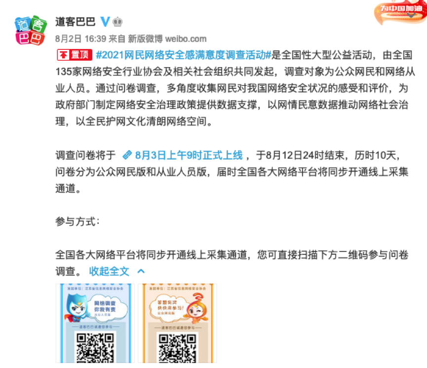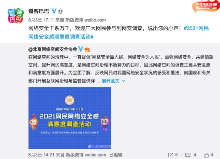 在公司黨支部的指導(dǎo)下,內(nèi)容運(yùn)營(yíng)部門充分利用微博、頭條等公眾平臺(tái),轉(zhuǎn)發(fā)活動(dòng)公告,引導(dǎo)更多網(wǎng)民關(guān)注本次調(diào)查活動(dòng)。8月3日北京網(wǎng)絡(luò)安全協(xié)會(huì)官方網(wǎng)站發(fā)布問(wèn)卷鏈接后,公司緊跟調(diào)查活動(dòng)開展進(jìn)度,通過(guò)發(fā)布問(wèn)卷二維碼鏈接,助力采集更多有效問(wèn)卷。3日至12日調(diào)查活動(dòng)開展期間,在公司黨支部的統(tǒng)籌領(lǐng)導(dǎo)下,公司各部門加強(qiáng)協(xié)作配合,充分發(fā)揮互聯(lián)網(wǎng)平臺(tái)信息傳播優(yōu)勢(shì),及時(shí)更新調(diào)研活動(dòng)信息,鼓勵(lì)用戶參與到調(diào)查活動(dòng)中。在公司內(nèi)部,黨支部通過(guò)組織開展員工問(wèn)卷填寫活動(dòng),助力公司進(jìn)一步明確網(wǎng)絡(luò)安全的內(nèi)容與要求,并安排相應(yīng)的業(yè)務(wù)培訓(xùn),強(qiáng)化員工網(wǎng)絡(luò)安全意識(shí),加強(qiáng)對(duì)用戶權(quán)益的保護(hù),全面提升公司整體網(wǎng)絡(luò)安全管理及業(yè)務(wù)水平。